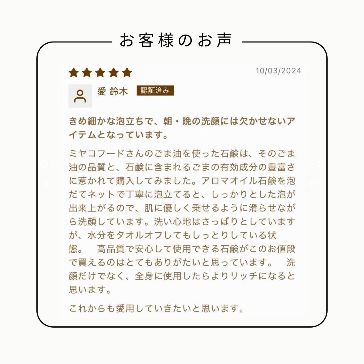 ●全成分/ゴマ油(ミャンマー産・一番搾り)、水、ヤシ油、オリーブ果実油、カカオ脂、水酸化Na、ジャスミン油