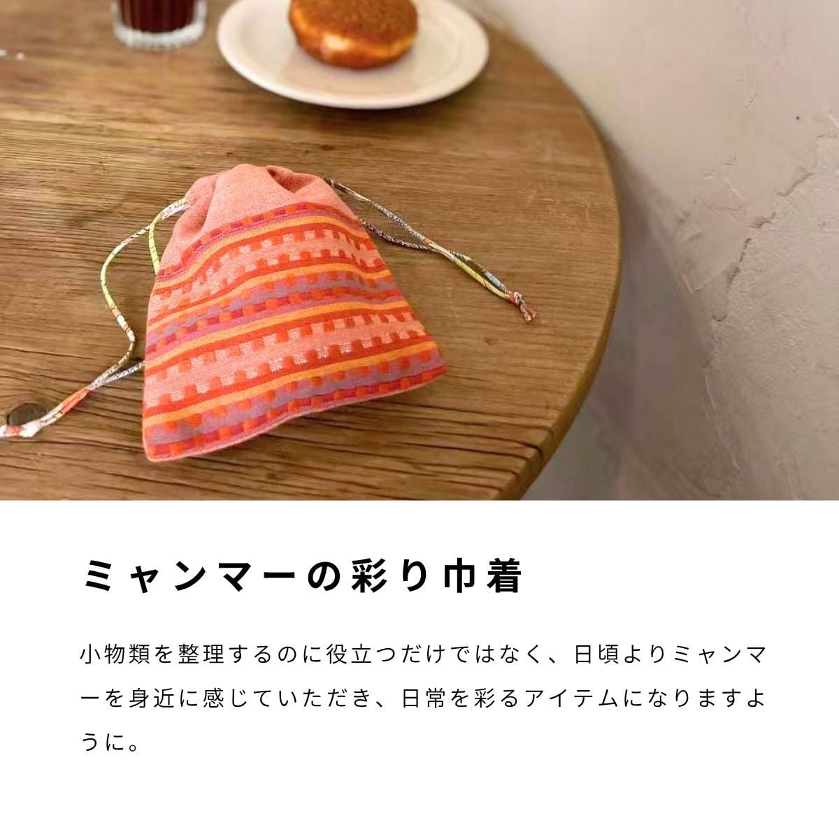 ミャンマーの伝統布「ロンジー」を使用して仕立てた、彩り豊かな巾着です。
